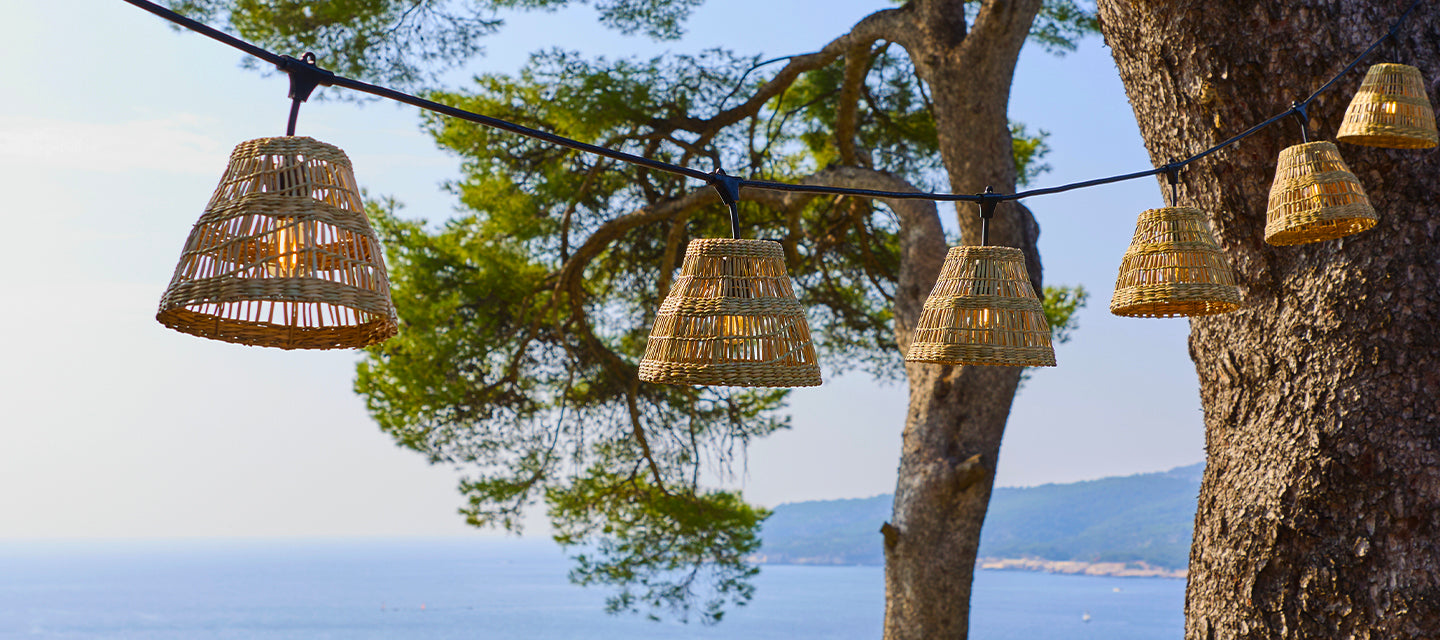 Guirlande lumineuse extérieur connectable 10 abat-jour naturels en bambou NATURA LIGHT HYBRID LED blanc chaud 8m solaire et sur secteur