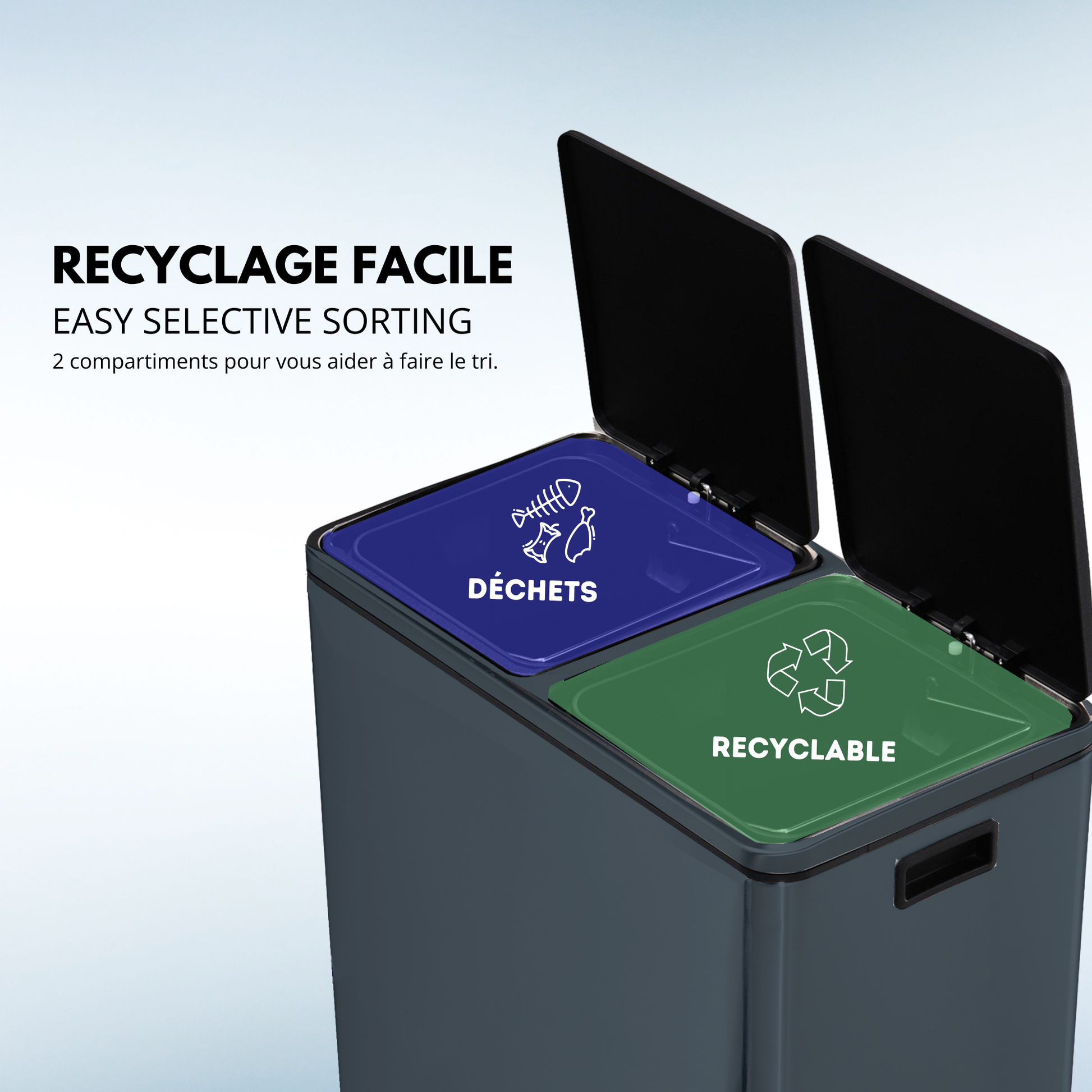 MAJOR 60L (2x30L) large capacity tri-selective pedal kitchen bin in matt black stainless steel