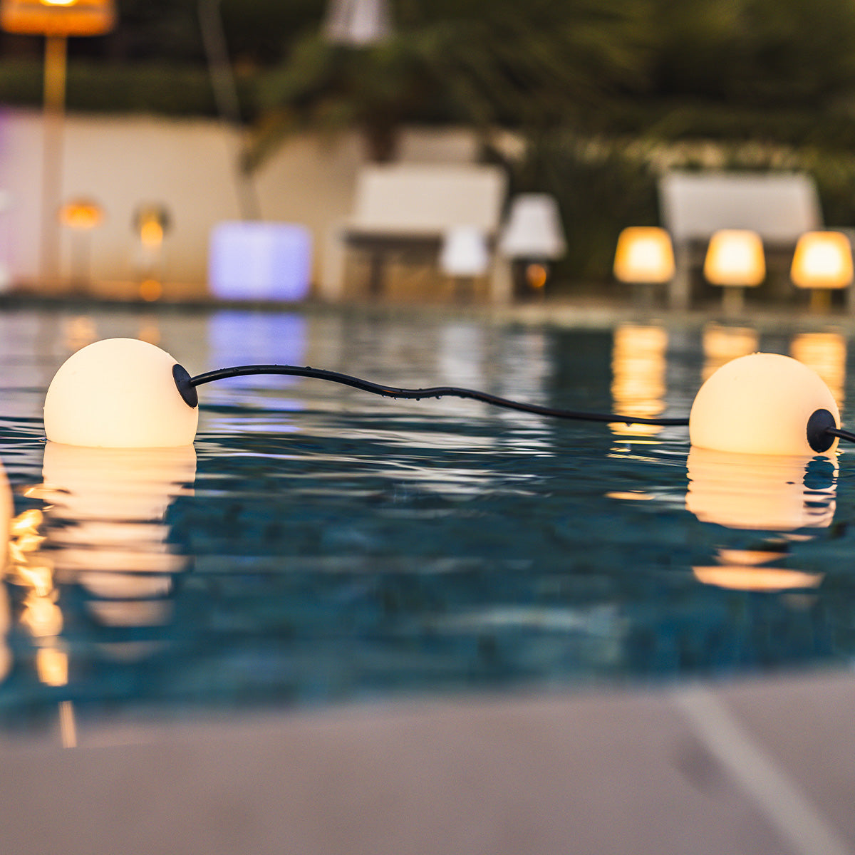 - GUIRLANDE LUMINEUSE LED : Bolly Light est une guirlande lumineuse d'extérieur, composée de 6 boules ampoules, mesure 5,5 mètres de longueur, idéale pour décorer une grande surface. Chaque boule a un diamètre de 10 cm, offrant un éclairage ample et diffus. Elle fonctionne sur une tension de 220-240 Volts et est équipée d'un câble de 200 cm jusqu'à la prise. Avec une protection IP67, elle est étanche et peut même flotter, ce qui la rend parfaite pour résister aux intempéries.