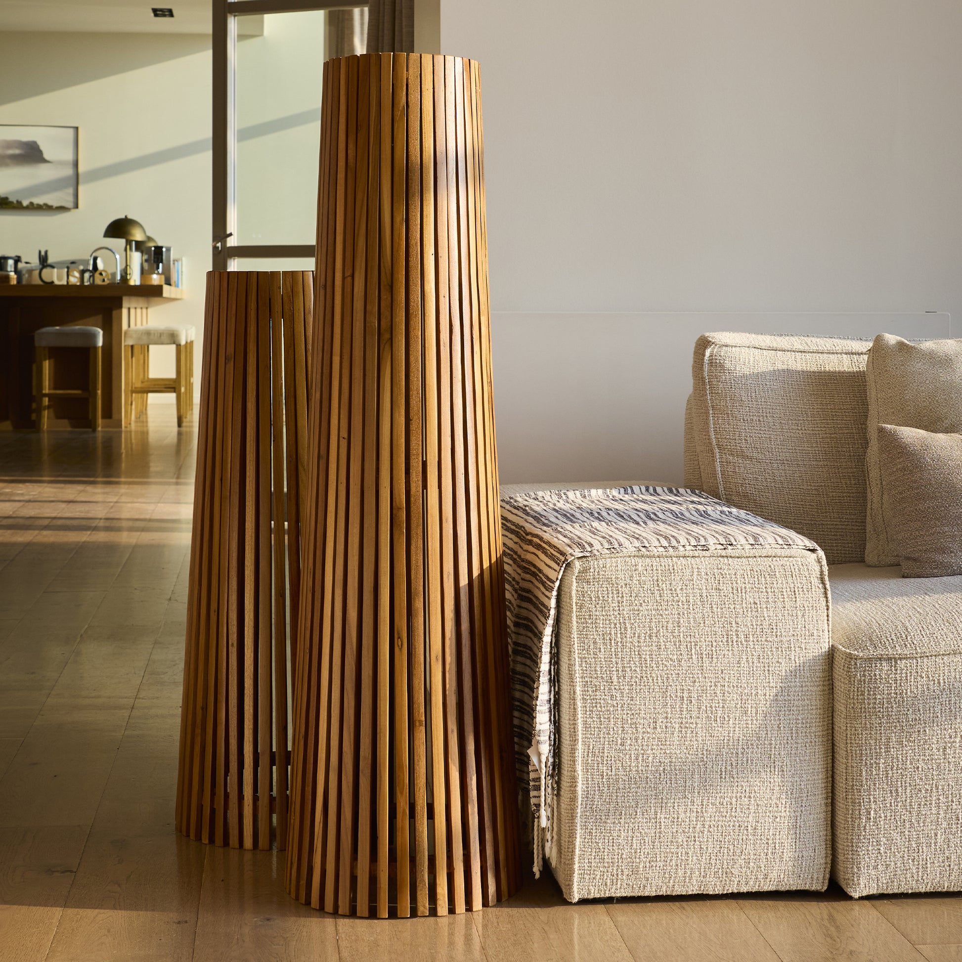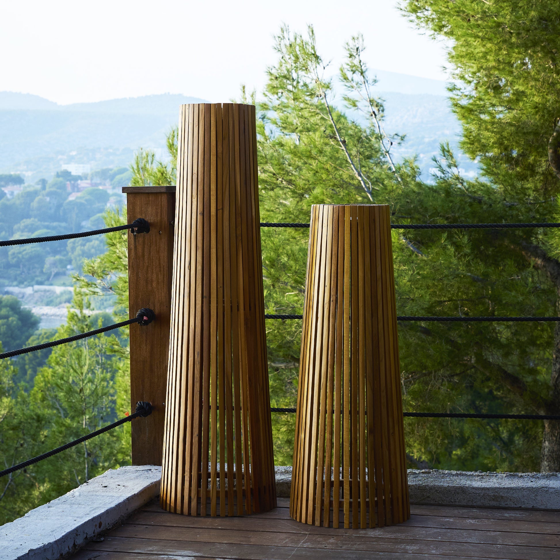 Lampadaire d'extérieur solaire TECKA TALL en bois teck avec module LED blanc chaud et télécommande H120cm