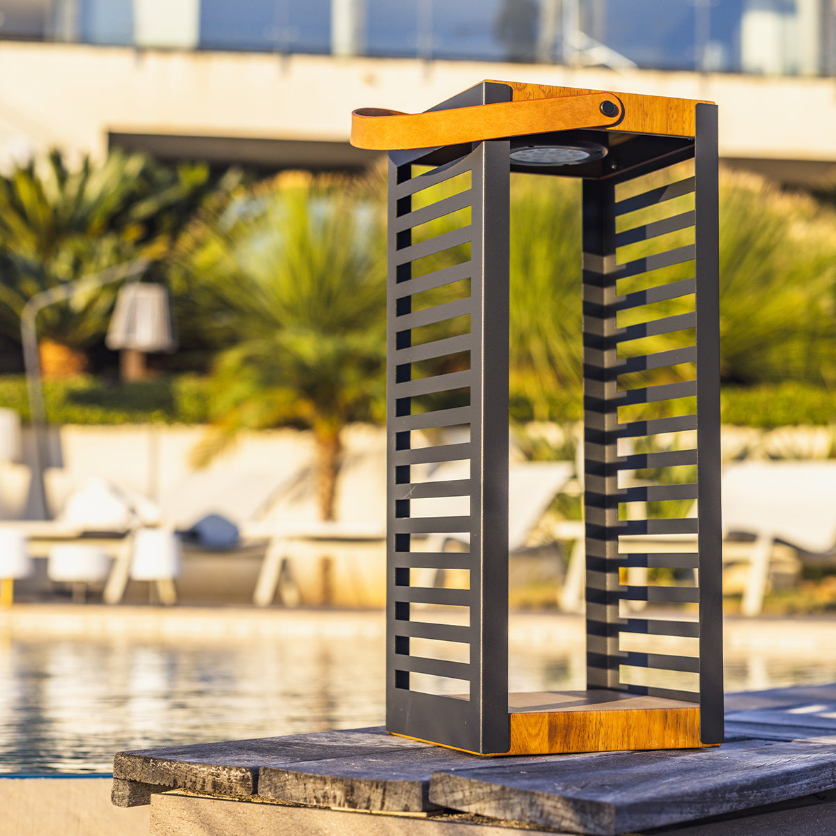 LANTERNE SOLAIRE LED : FERIAN TALL est une lanterne solaire en métal et effet bois. Elle dispose d'une base LED solaire rechargeable SUNNY SQUARE qui se fixe et retire facilement. Elle est idéale à poser sur le terrasse, au bord de la piscine, dans un coin salon extérieur. Vous pouvez également la suspendre grâce à sa poignée. Dimension : 20 x 20 x H50cm