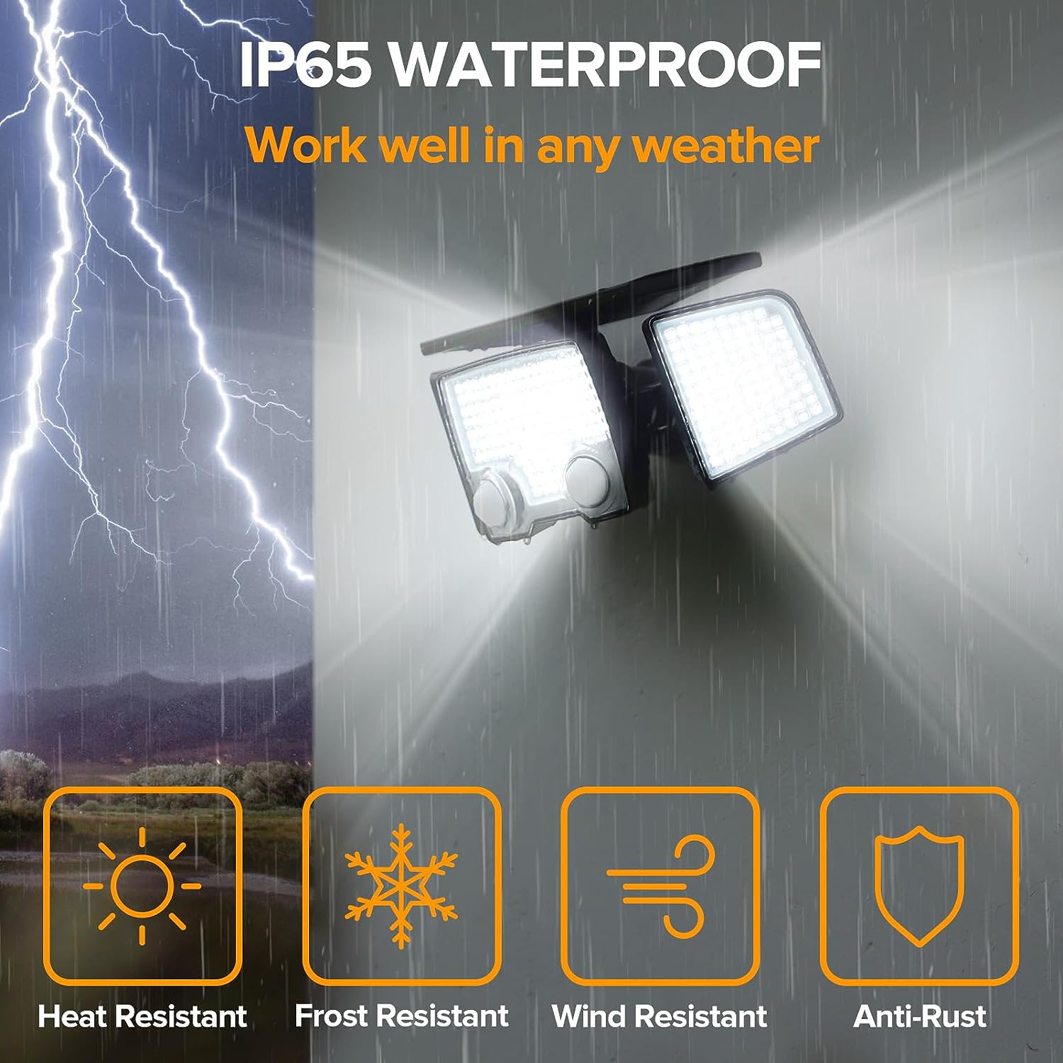 Résistant : Le projecteur solaire s'adapte à toutes les conditions météorologiques, il ne rouille pas. En effet, il résiste à la chaleur, au givre, et aux intempéries grâce à son indice de protection IP44. Il est idéal pour votre extérieur tout au long de l'année quelle que soit la météo.