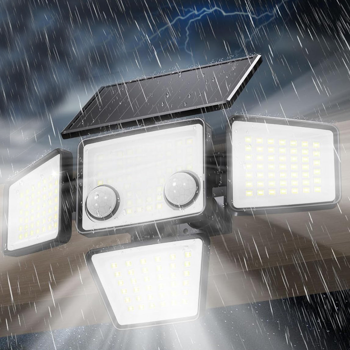 - Éclairage puissant et large couverture : Lot de 4 projecteurs solaires FAIRVIEW à 4 têtes orientables (horizontal/vertical), équipés de 188 LEDs ultra-lumineuses. Avec 700 lumens et un angle d’éclairage de 270°, ils illuminent efficacement vos jardins, allées, garages et zones sombres, bien plus larges que les spots classiques à 90°.