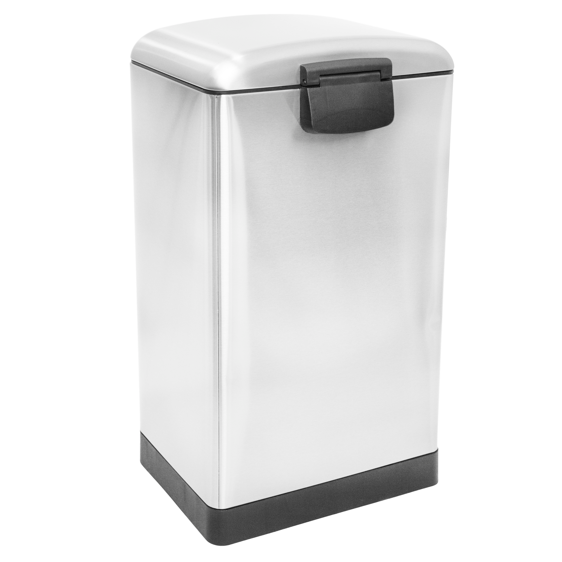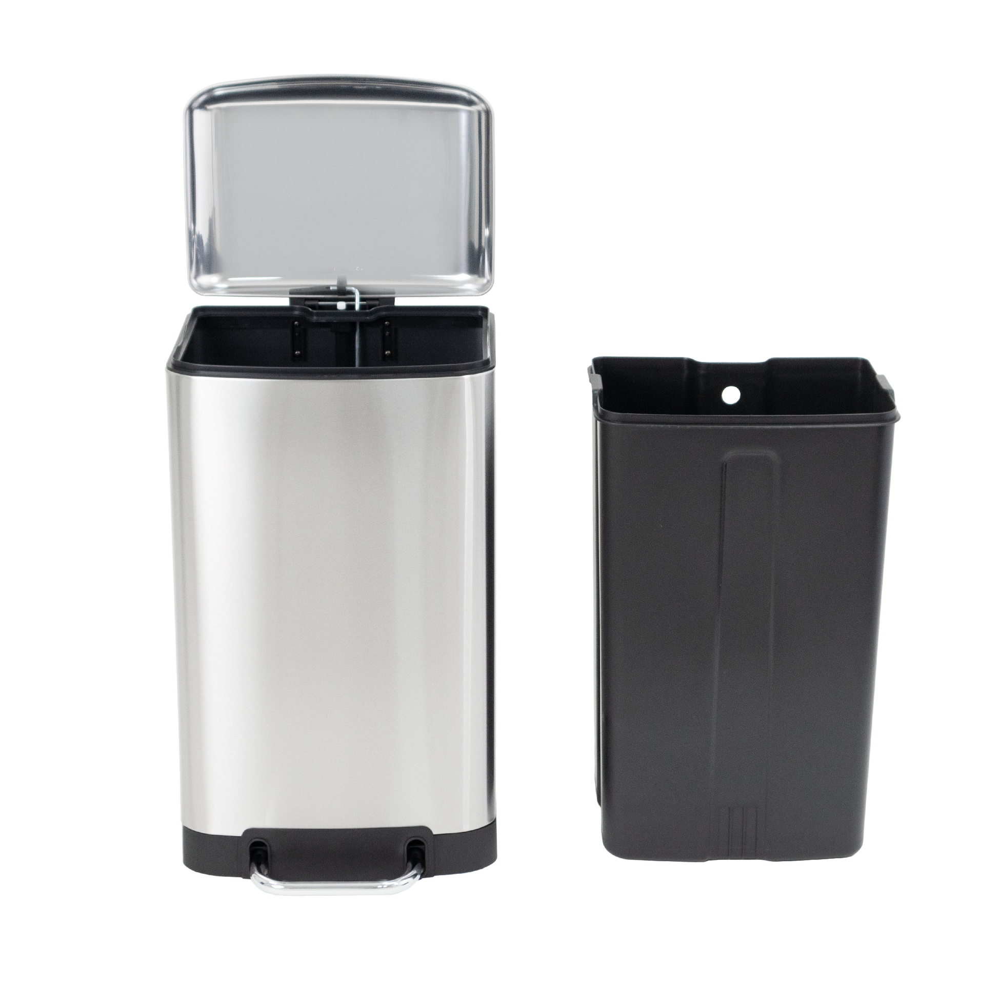 - Body and lid in stainless steel (0.4mm) . Included: A bucket to hold your trash bag, and a protective plastic edge for protecting fragile floors.
