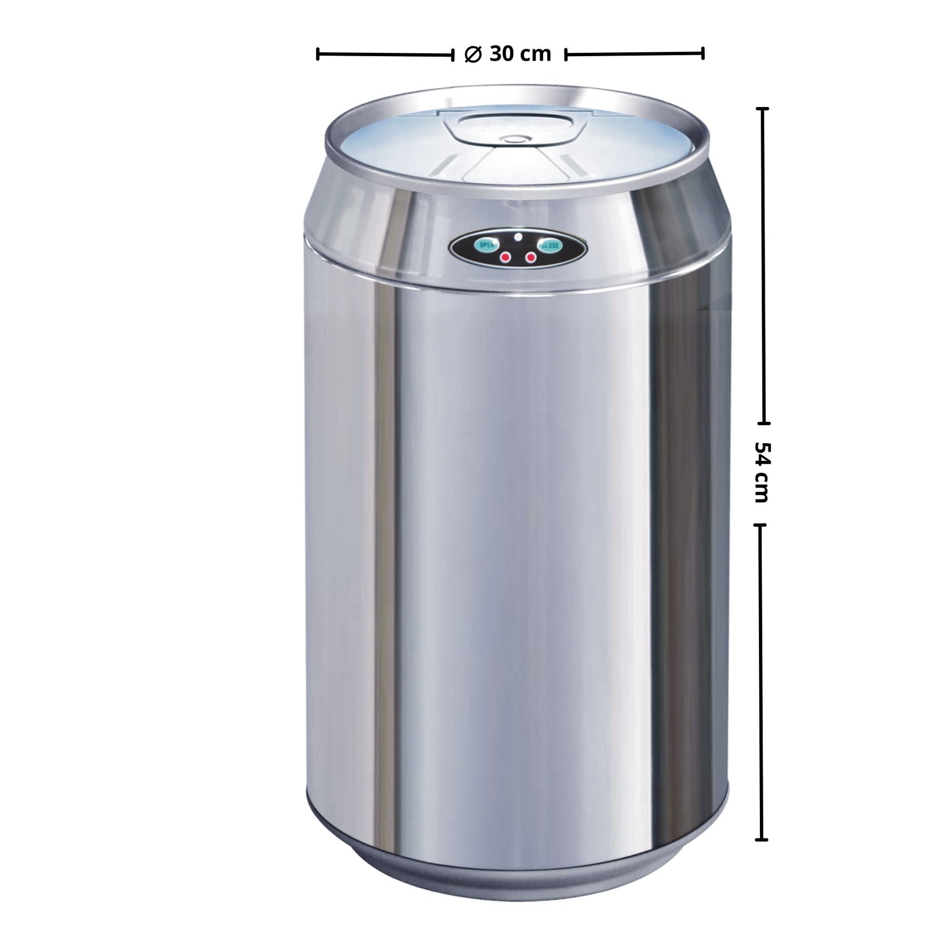 - Round automatic kitchen trash can with bucket Capacity 30L CAN model Stainless steel can shape Mirror polished stainless steel finish Dimension: ∅30x54cm Weight: 3.2kg