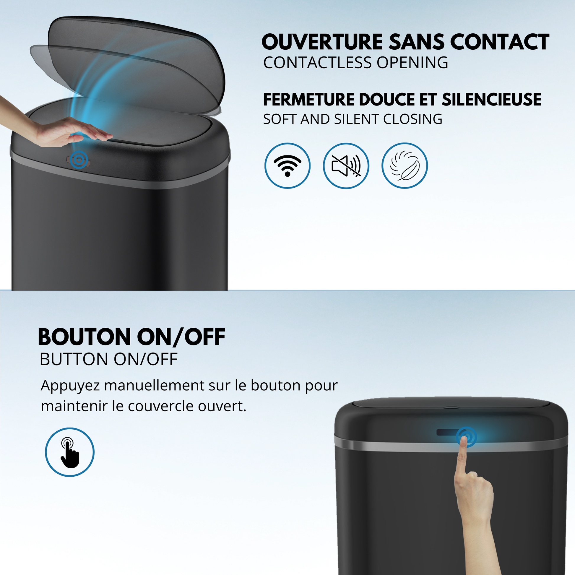 - Possibilité de maintenir le couvercle ouvert grâce aux boutons OPEN / CLOSE (pour une ouverture prolongée). Ses matériaux lisses (fer non-corrosif INOX fin et ABS) facilitent son entretien. Assemblage non requis. Plus qu'une poubelle, un meuble design. Il n'est pas utile de se baisser pour jeter ses déchets. Poubelle Stable. Base antidérapante. Fermeture silencieuse et Anti-Traces de Doigts.