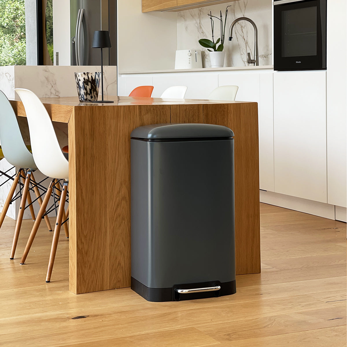 - More than a bin, a designer piece of furniture. It is not necessary to bend down to throw away your waste. Stable trash can. Non-slip base. Silent closing and Anti-Fingerprints. This trash can has it all. No need to hide it in a corner: make it an integral part of your decor. Ideal for the kitchen, bathroom, office, bedroom, laundry room and any other walk-through area where you need a trash can. Modern and elegant look.