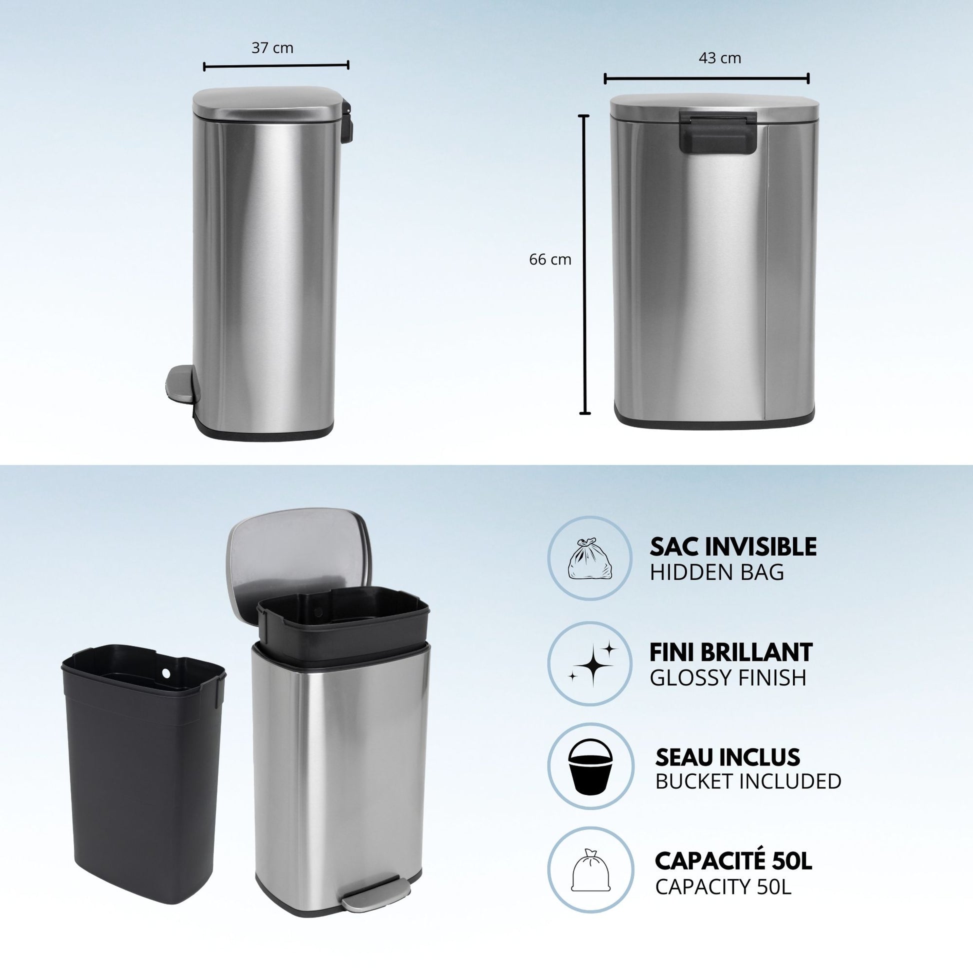 - Rectangular pedal kitchen bin with bucket Capacity 50L with manual foot pedal ADMIRAL model in stainless steel Brushed stainless steel finish Dimension: 43x37xH66cm Weight: 5.1kg.