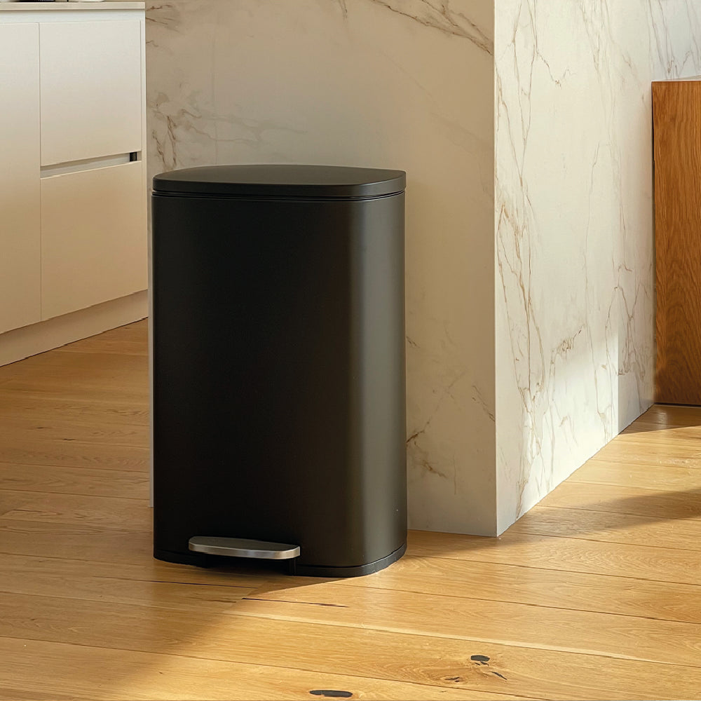 - Trash can with high-end professional quality finish, robust materials. Solid pedal mechanism. Very easy to use. Soundproof and odor-proof closure. Silent thanks to its shock absorber and slow closing system. Easy opening thanks to its wide pedal. Easy to move with a sturdy carry handle. Easy to clean thanks to the inner plastic bucket