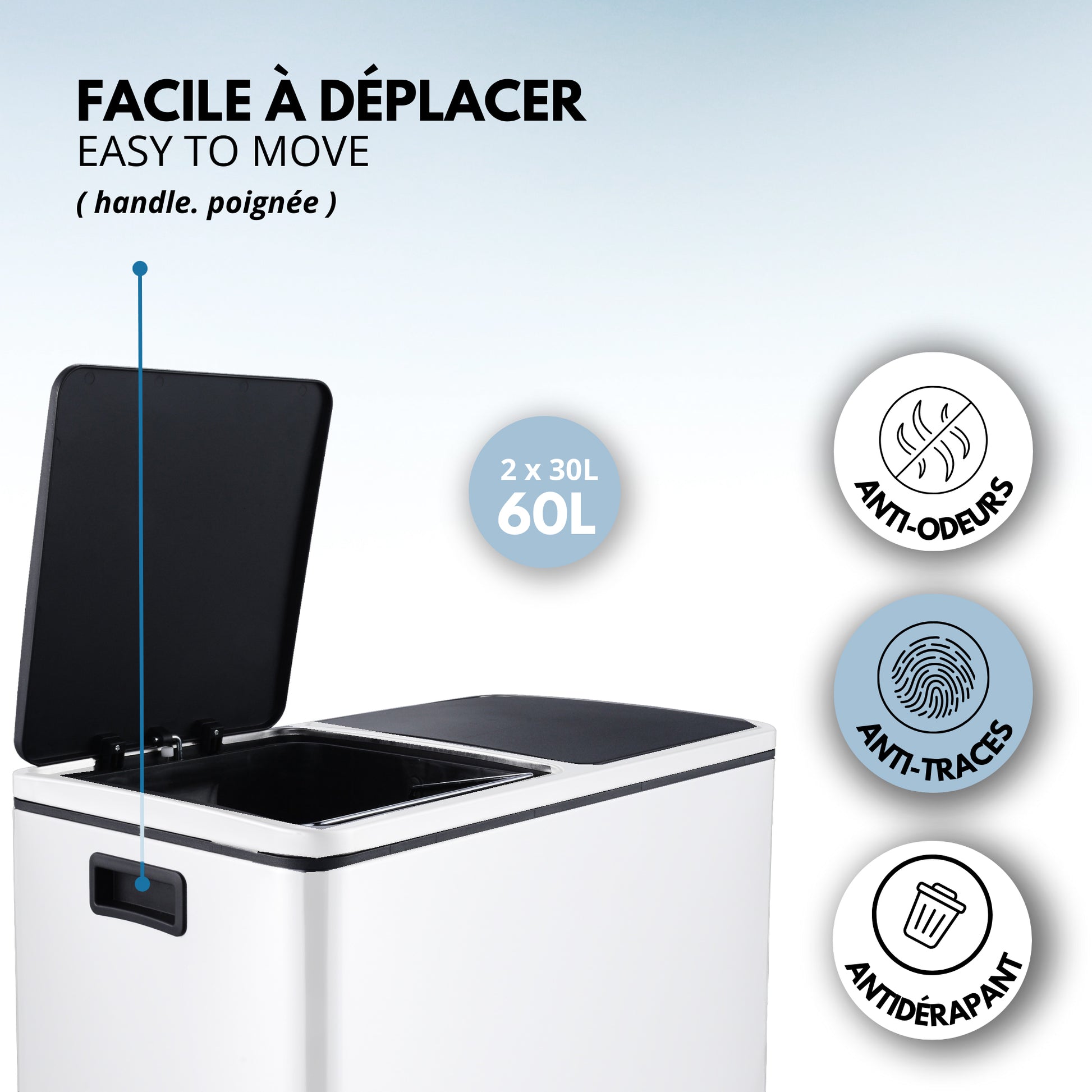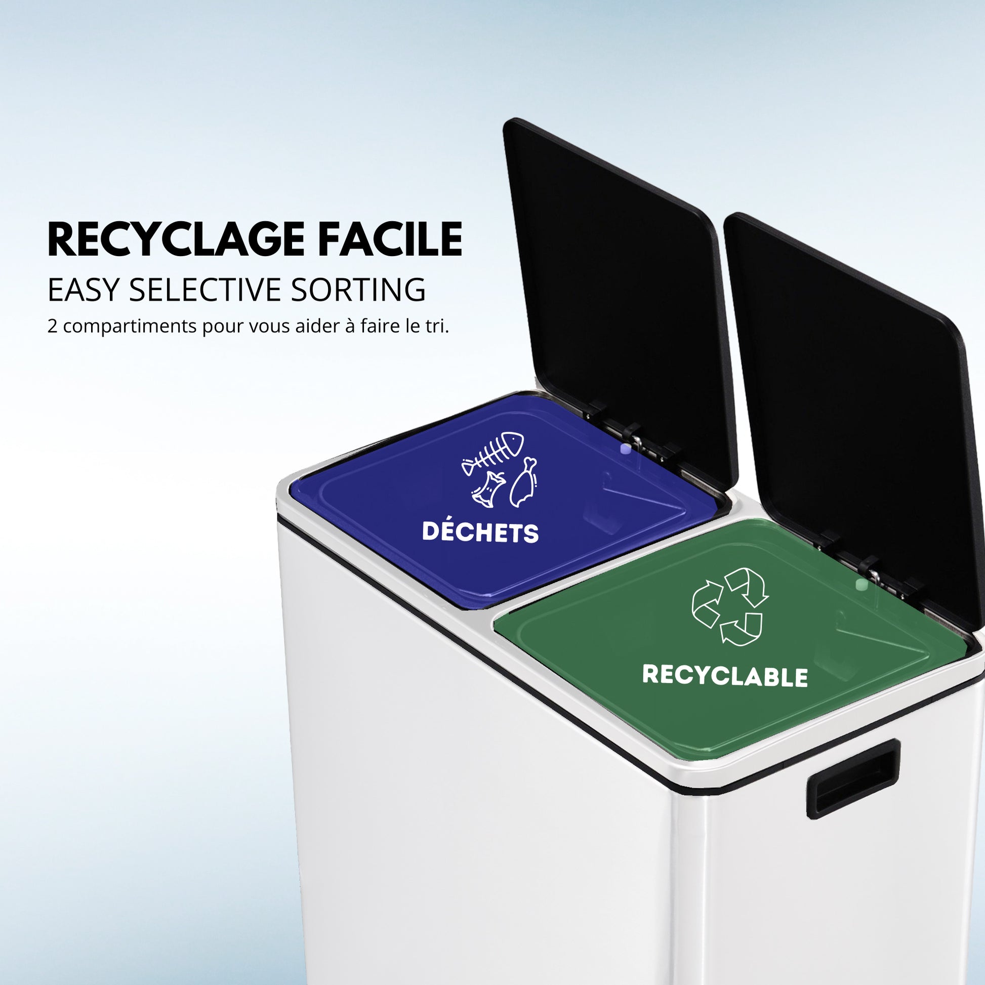 Poubelle de cuisine à pédale tri sélectif grande capacité 60L (2x30L) MAJOR en acier Inox Blanc
