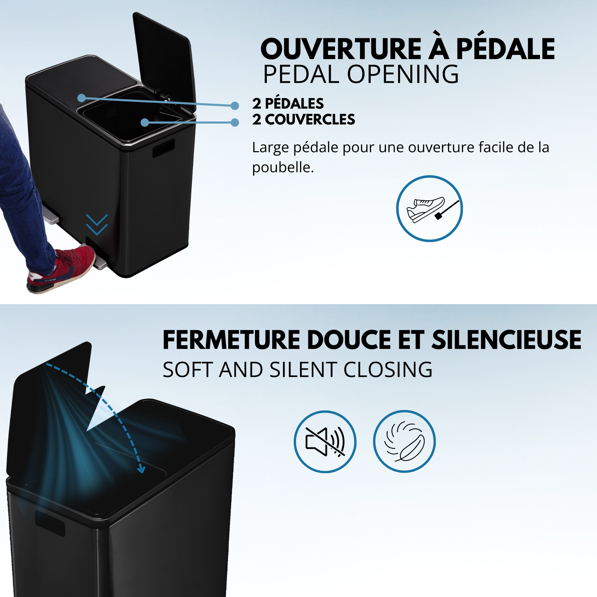 - Bin with manual foot pedal. Sturdy materials. Solid pedal mechanism. Very easy to use. Soundproof and odor-proof closure. Silent thanks to its shock absorber and slow closing system. Easy opening thanks to its wide pedal. Professional quality. High end finish. Easy to move with a sturdy carry handle. Easy to clean thanks to the inner plastic bucket