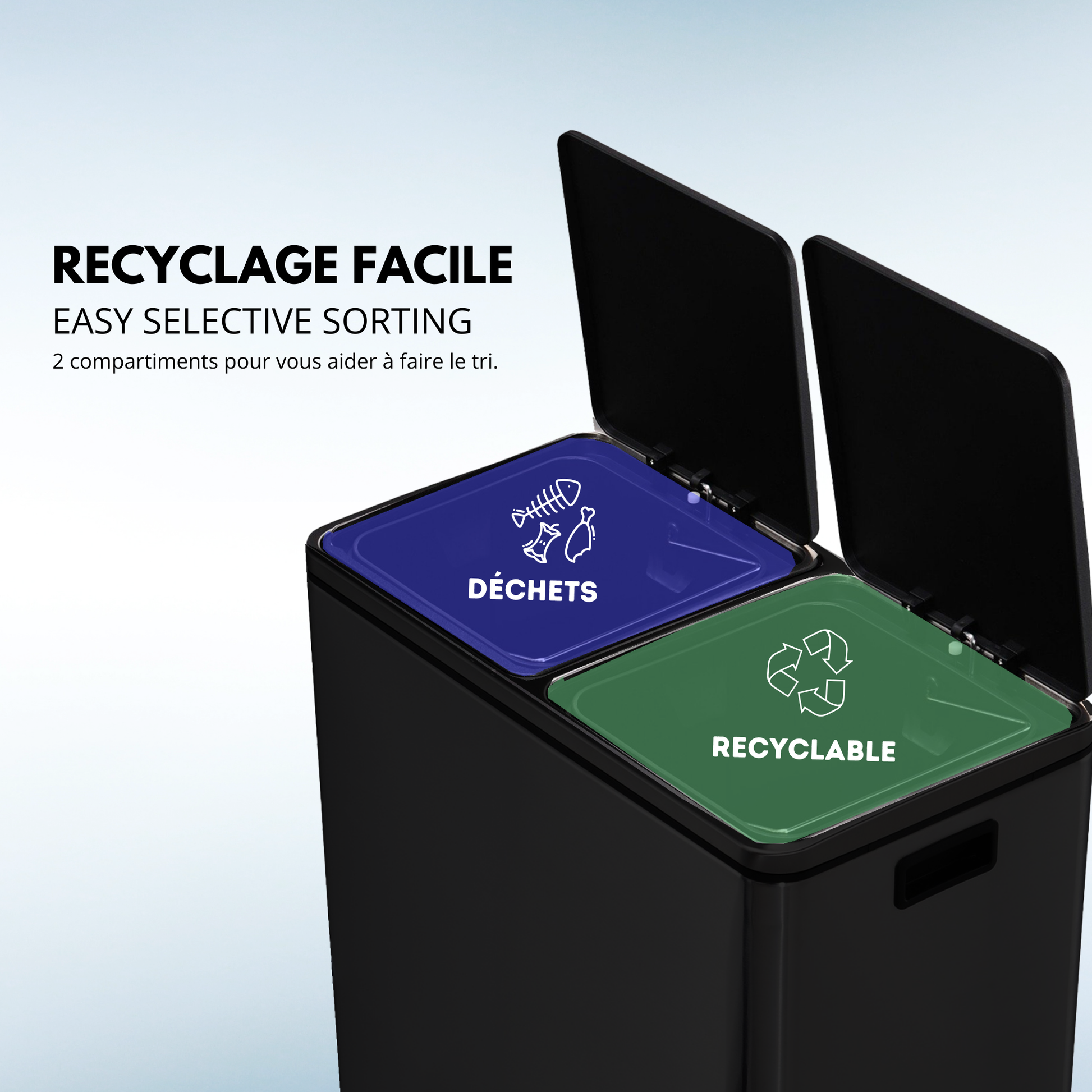 MAJOR 60L (2x30L) large capacity tri-selective pedal kitchen bin in matt black stainless steel