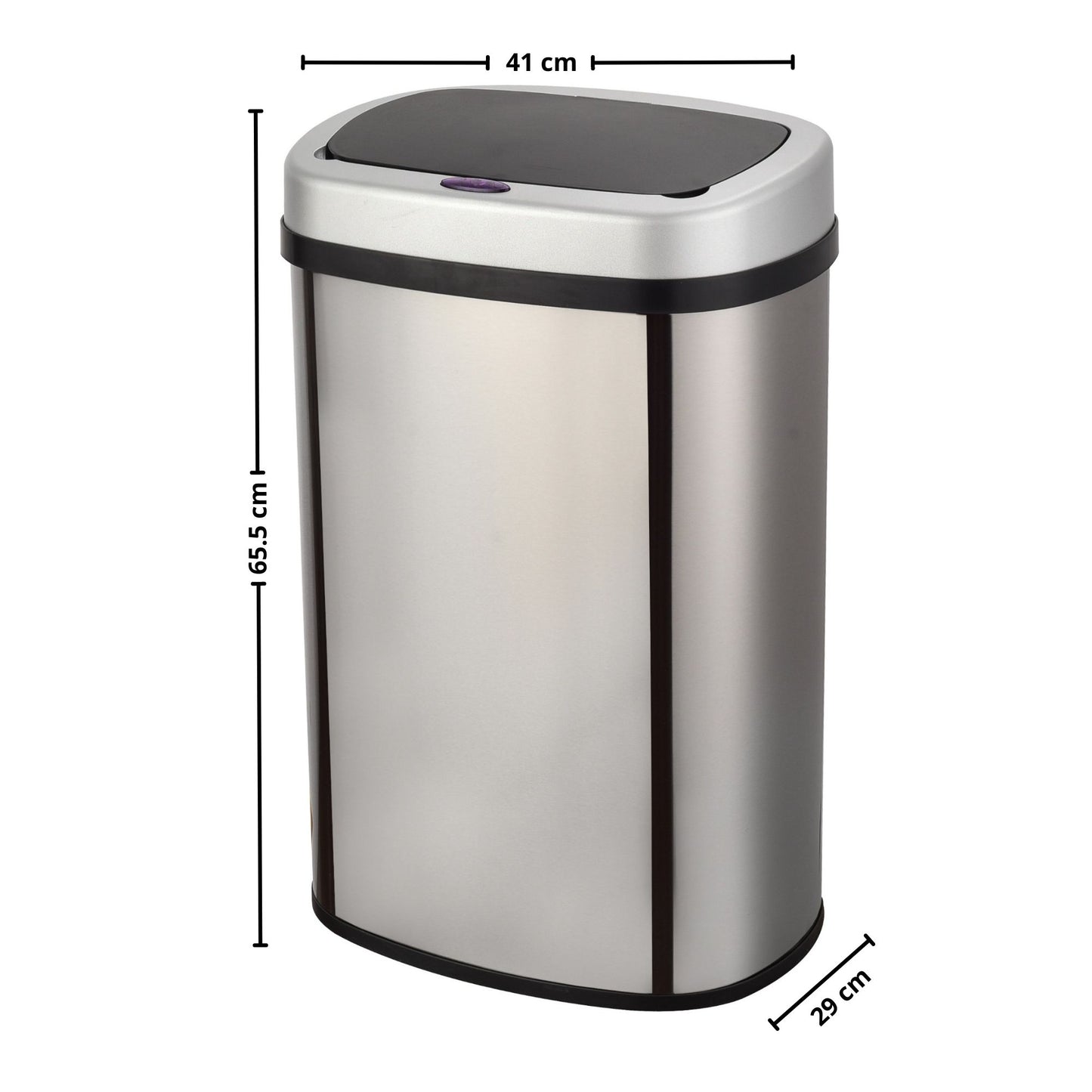 - Rectangular automatic kitchen bin with strapping Capacity 58L MAJESTIC SILVERY model in stainless steel Brushed stainless steel finish Dimension: 41x29xH65cm Weight: 3.4kg . With low battery indicator. New lid.
