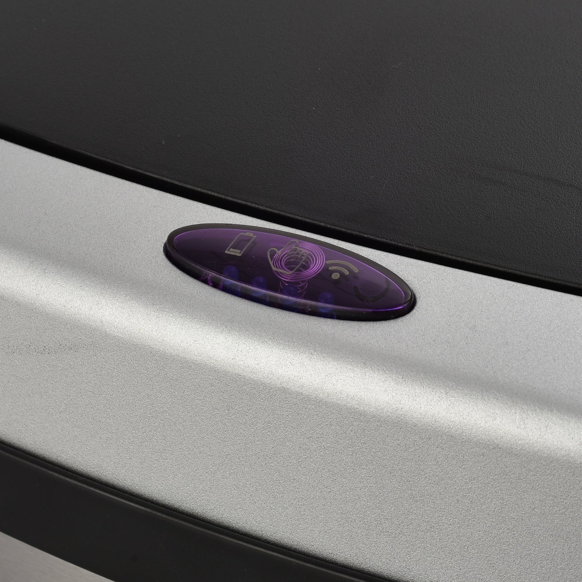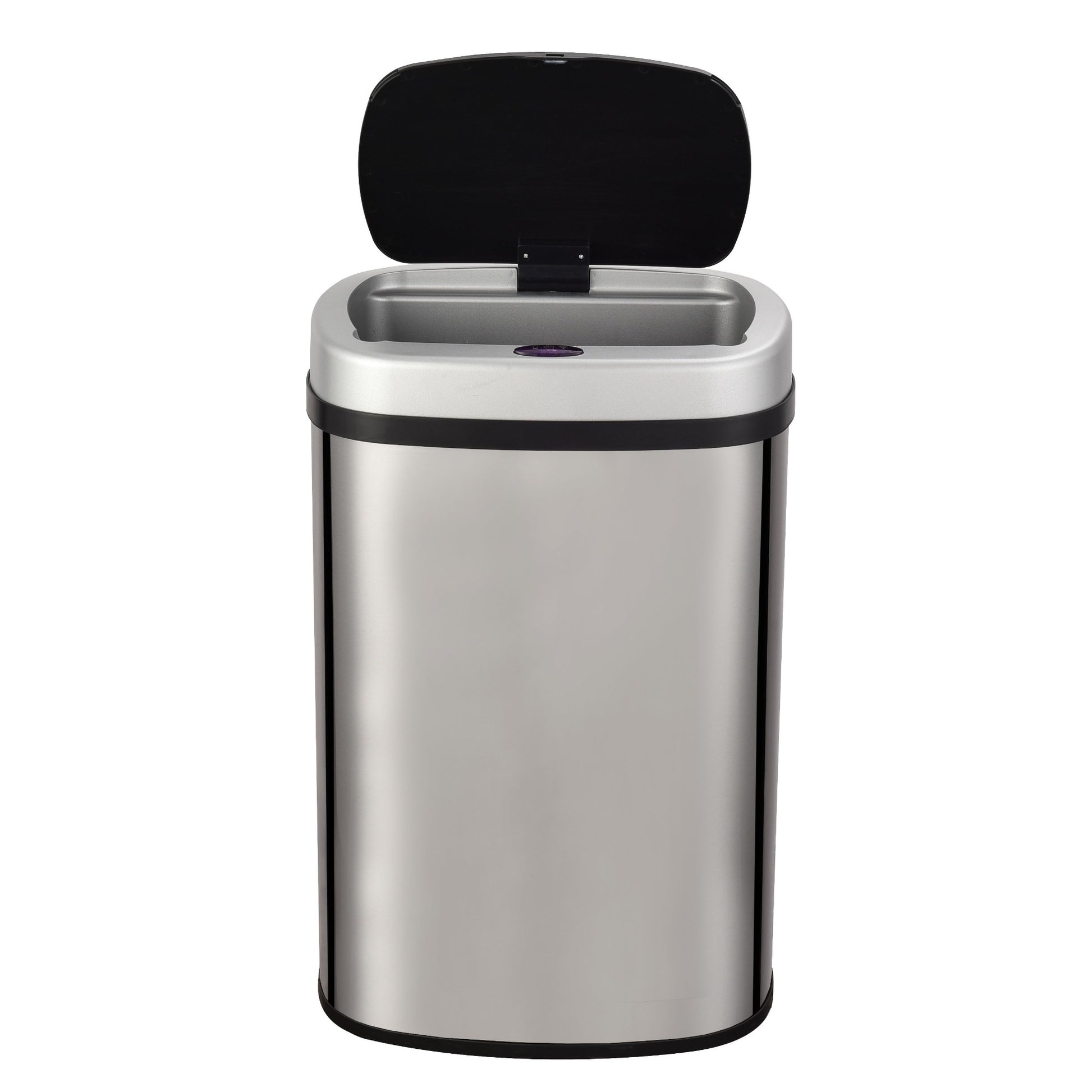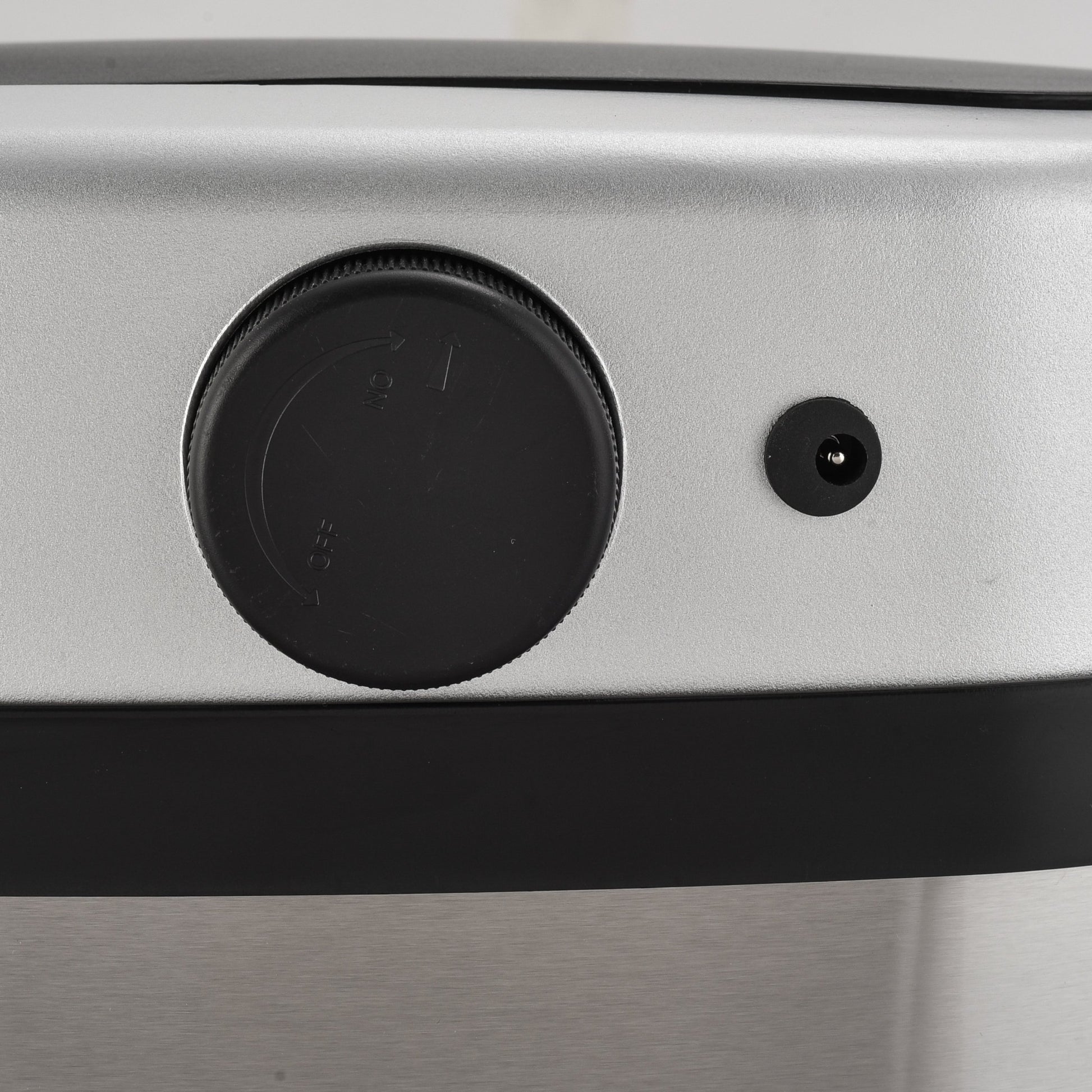 - Stainless steel body (0.4mm) and ABS cover. Works with 4 LR06 batteries (not included). ON/OFF button (to keep the lid open). Included: A plastic strapping to hold your garbage bag, and a ring on the ground for the protection of fragile floors.