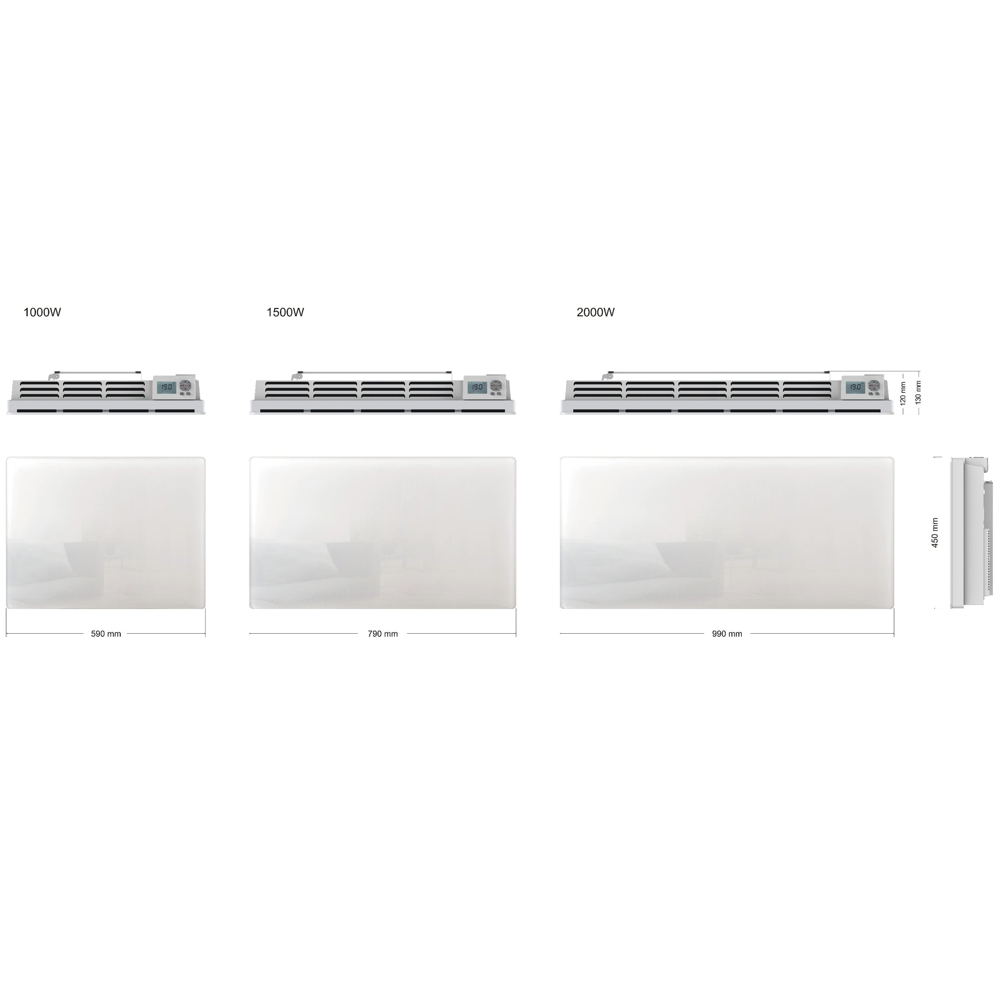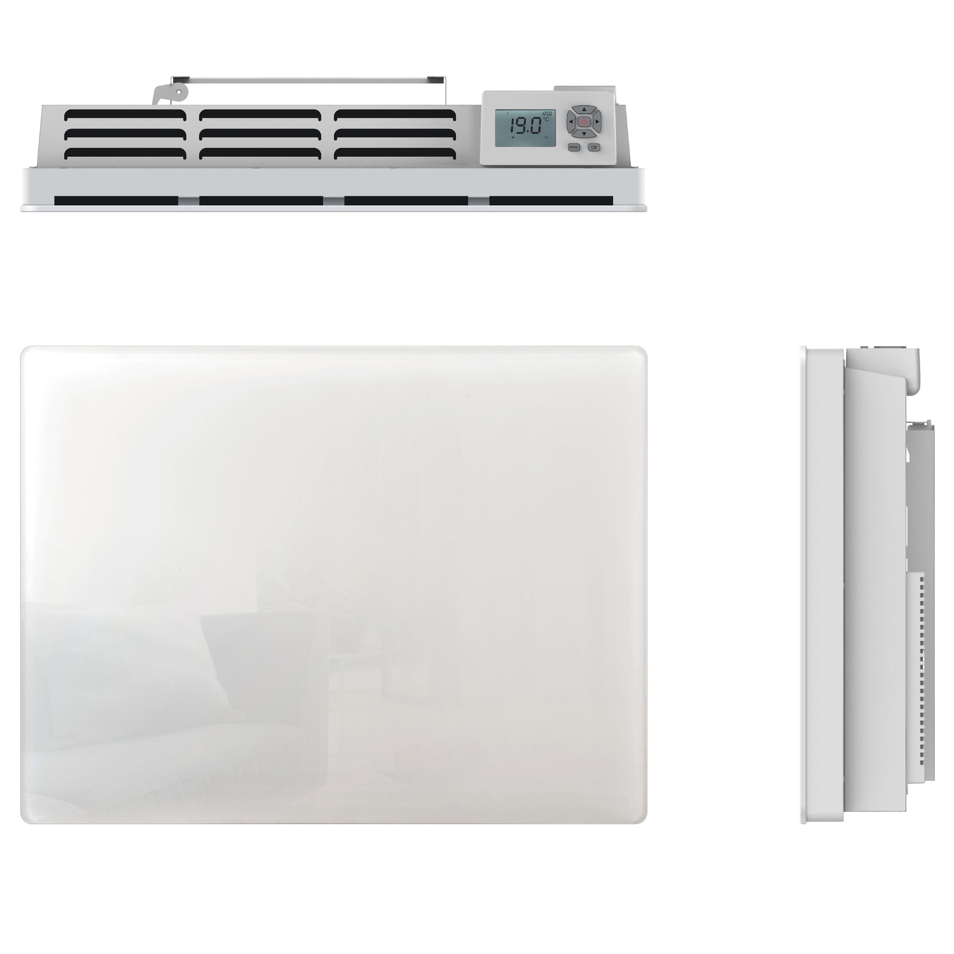 Ceramic dry inertia heater with glass front. Electronic control with LCD digital screen, 4 modes (comfort, normal, eco and frost protection), 3 pre-installed programs, Daily and daily programming, Open window detection, Overheating protection, 6-order pilot wire, Curved panel, New ERP(2015) /1188) Directive, Class II, IP20. CE/NF/RoHS/ERP standard. 2 year warranty