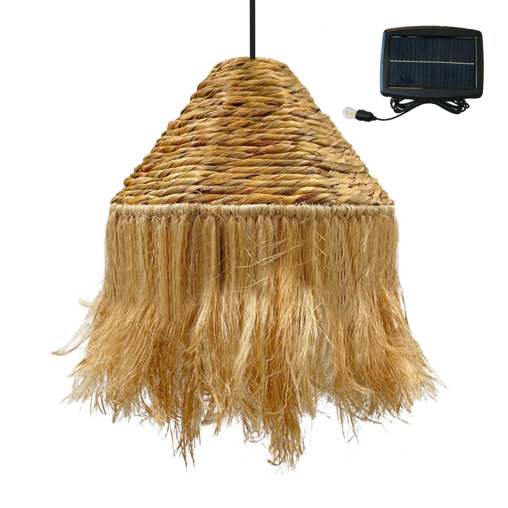 FABRICATION ARTISANALE : La suspension solaire LEONORA SOLAR issue de l'artisanat fabriquée en jacinthe d'eau et en fibre de bananier. Ce matériau résistant est à la fois souple et rigide, ce qui permet une multitude de formes. Afin de maintenir l'abat-jour en bon état, il est préconisé de le suspendre dans un endroit sec, à l'abri de l'humidité et de la pluie.