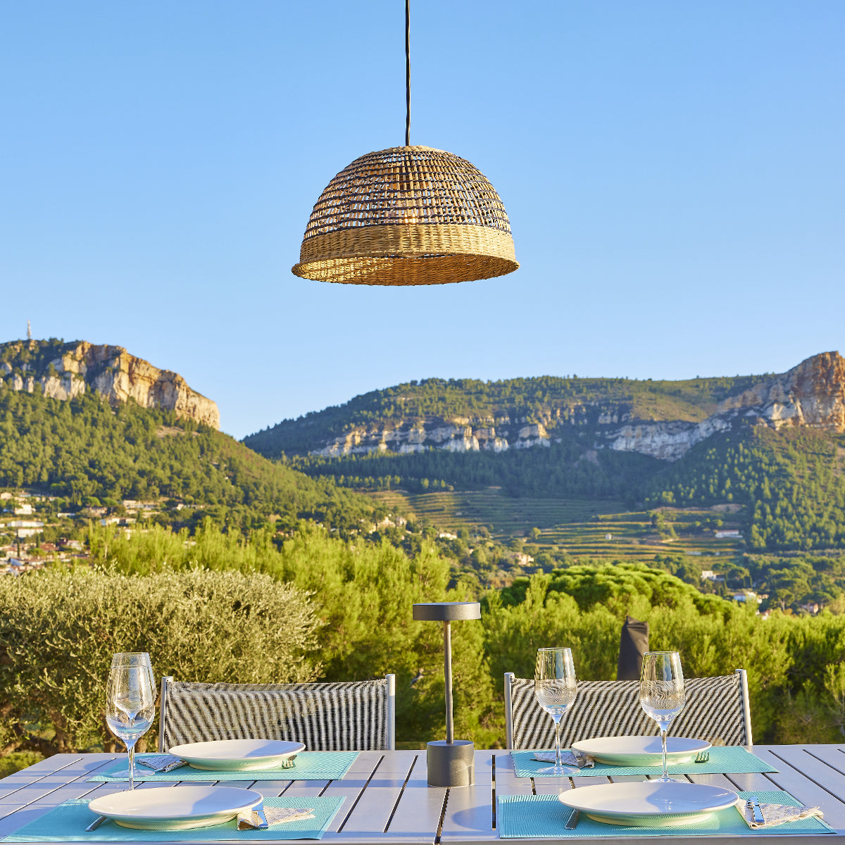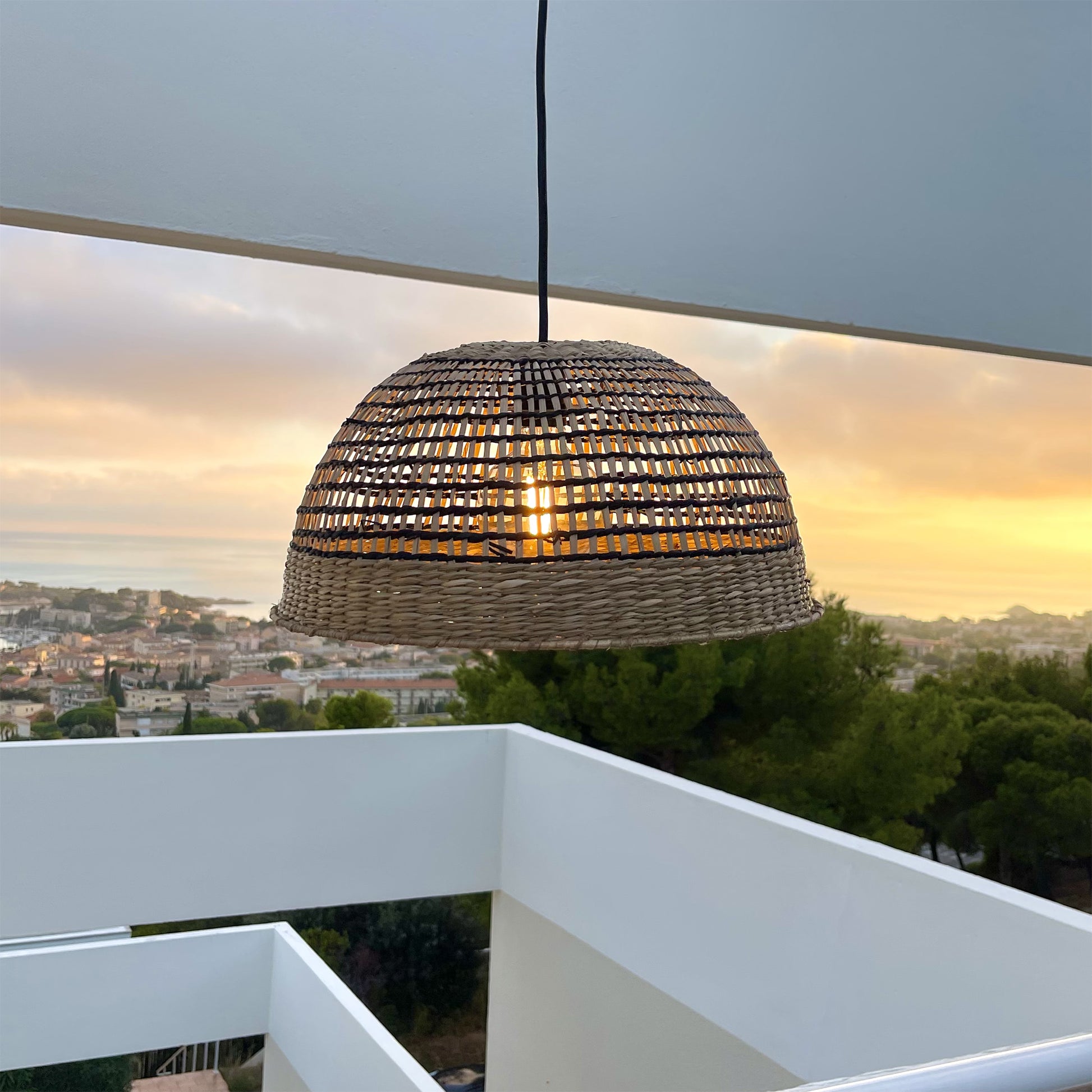 NATURAL RATTAN SHADE : The CESARE OUTDOOR CABLE suspension, resulting from craftsmanship, is manufactured in woven seagrass. Braided seagrass is extremely strong and durable. It is a material that is both flexible and rigid which allows a multitude of shapes. Exotic and warm, it will highlight a modern interior and will adapt perfectly to a more bohemian or vintage style thanks to its ethnic chic look. Its unique braiding will enhance your living space. Dimensions: 38 x 38 x H19 cm