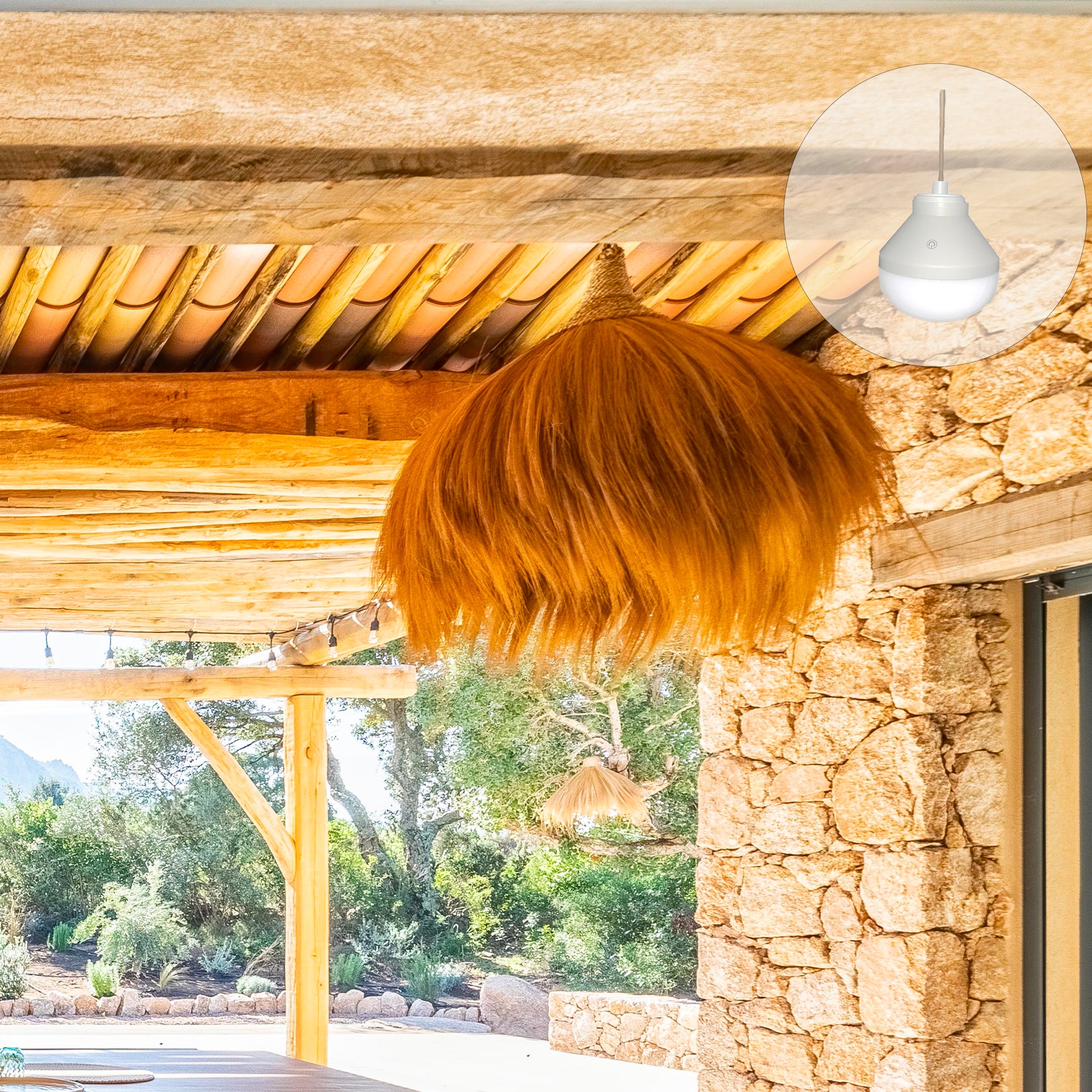 La suspension artisanale Big Masai Nomad est fabriquée à partir d'herbe de rayung séchée offrant un design exotique et majestueux de 80 cm de diamètre pour 62 cm de hauteur. Livrée avec l'ampoule LED autonome Lys, elle propose un éclairage blanc chaud et multicolore RGB ajustable par télécommande. Grâce à son système magnétique sans fil, elle se suspend n'importe où sans aucun besoin de raccordement électrique, offrant une autonomie technique de 11 heures. Certifiée IP44, elle résiste aux projections d'eau pour un usage extérieur durable sous une pergola ou une véranda. Le cordage naturel est reconnu pour sa solidité et sa résistance aux conditions extérieures variées. Maintenez l'abat-jour au sec. Parfaite pour les repas en plein air, les apéritifs ou les soirées d'été, elle crée immédiatement une ambiance douce et accueillante.