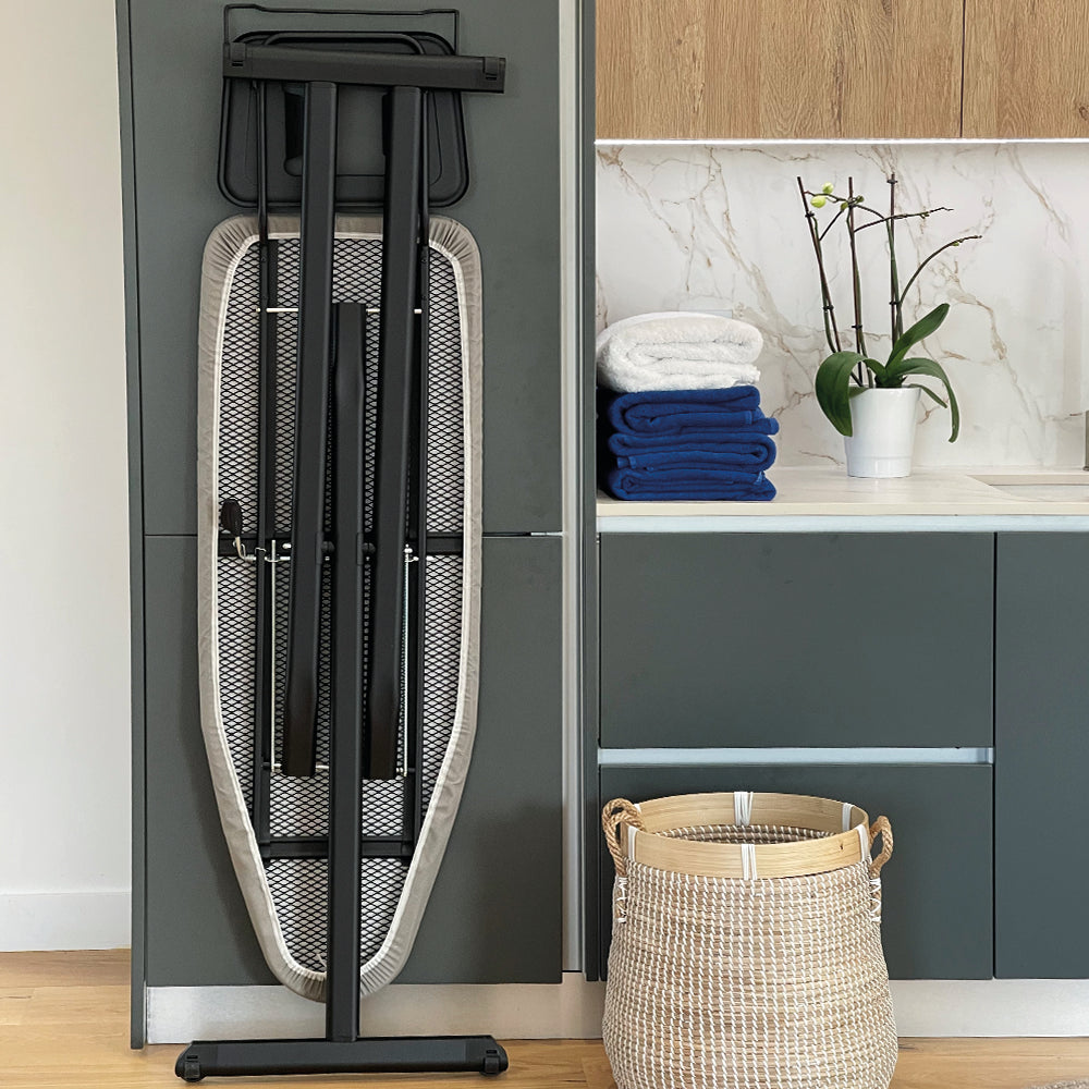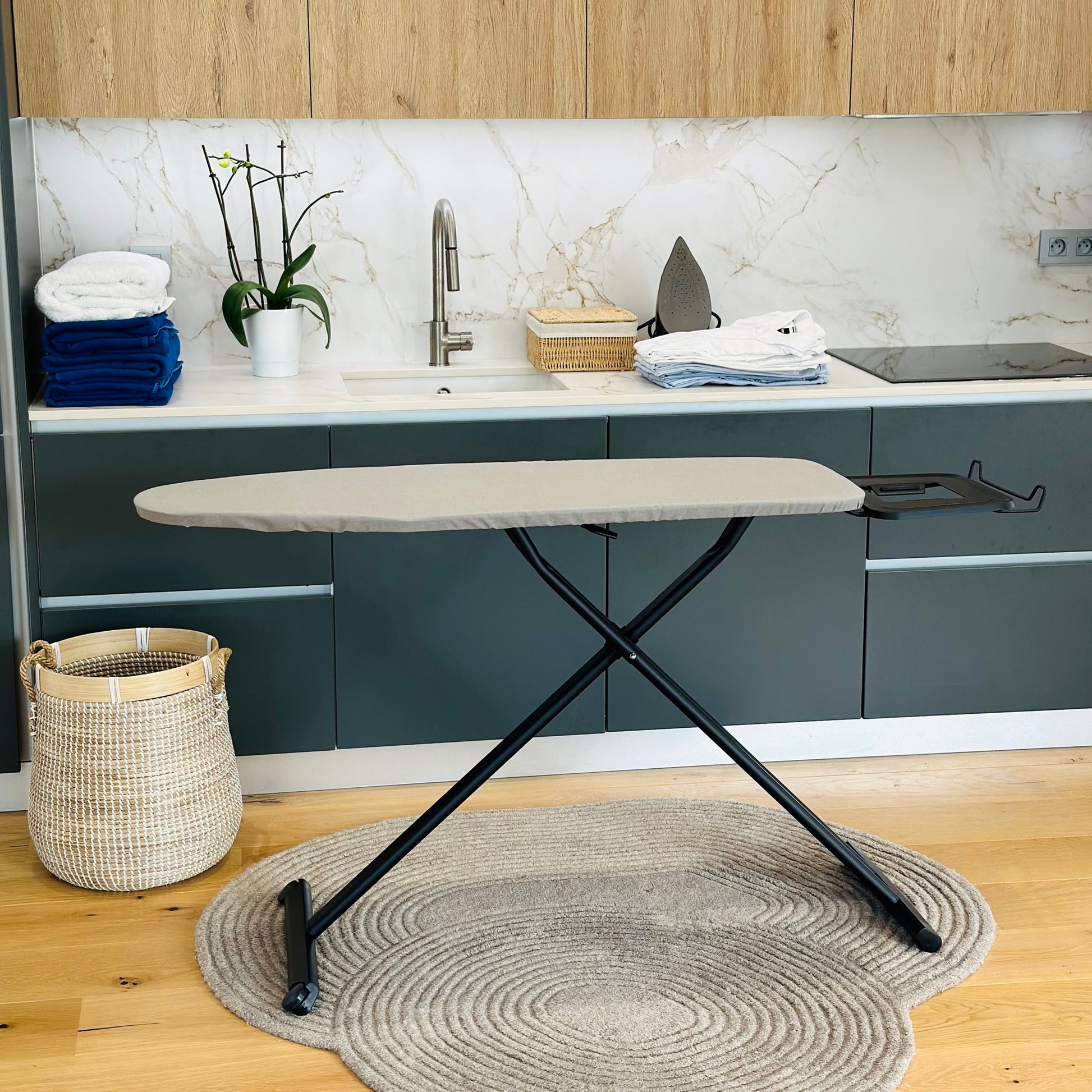 - Stable aluminum ironing board. 3 solid and ergonomic legs. Steel thickness: 0.8 mm. Non-slip feet. Durable and solid aluminum structure